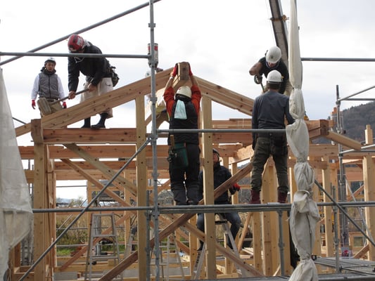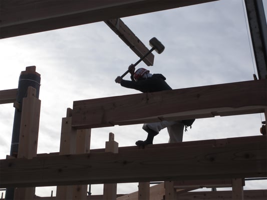 建て方当日の朝、建て主さんと職人さん全員で工事の安全と無事を祈り乾杯をして作業開始。予め仕口を刻まれた柱・梁が次々と組みあがっていき、1日の終わりには見事な家のかたちが姿を現しました。