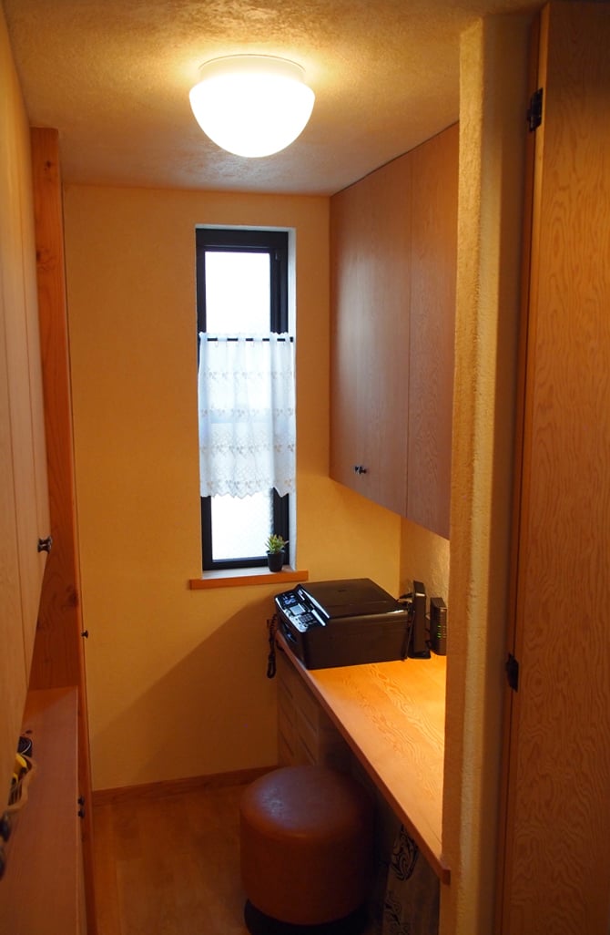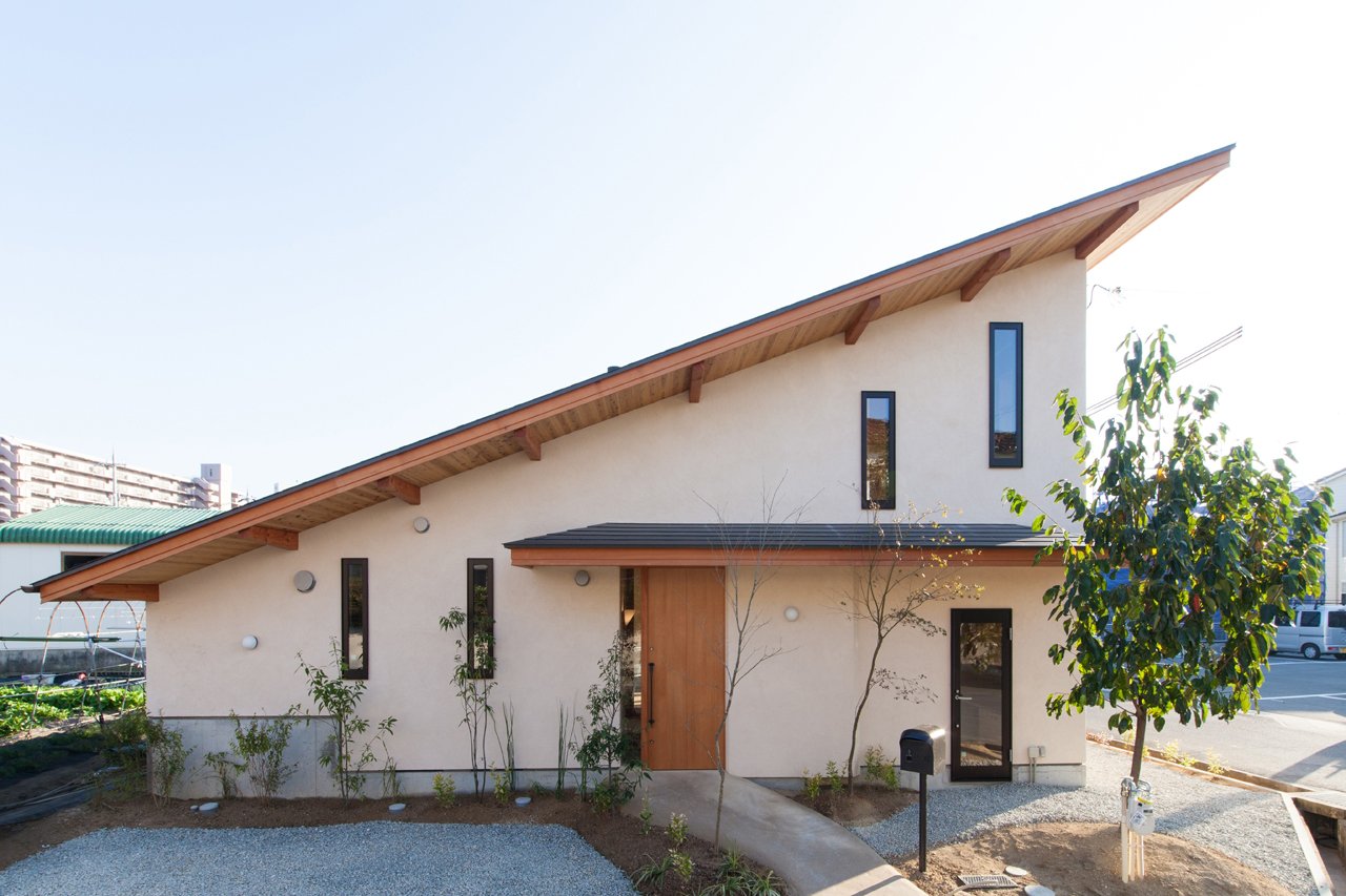 リビングの大きな窓から植栽と隣地の果物畑の眺めを取り込み、街中にありながら自然を身近に感じる事ができます。限られた面積の中で、ロフトスペースを利用することで収納と三人の子供さんの個室を確保しています。
