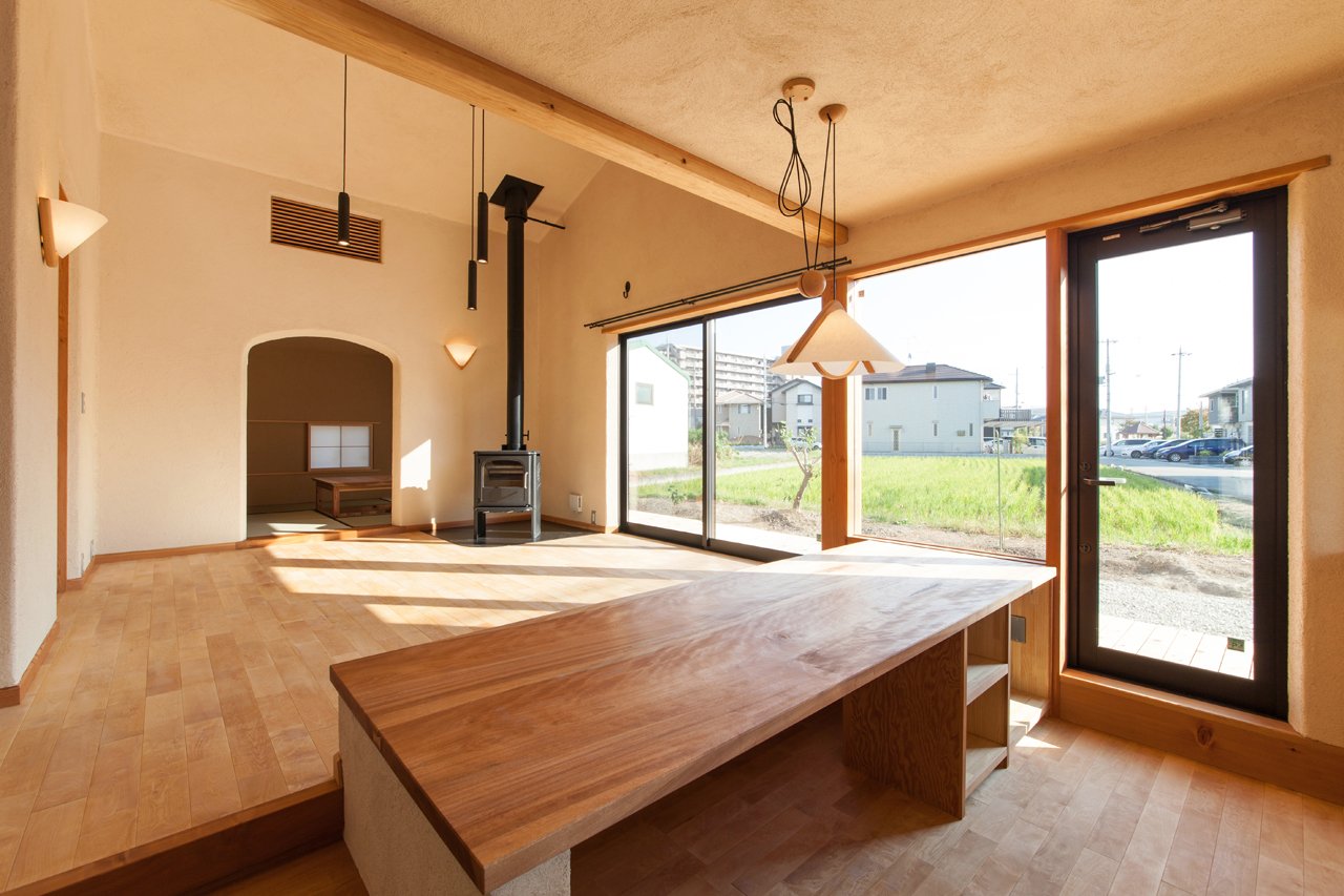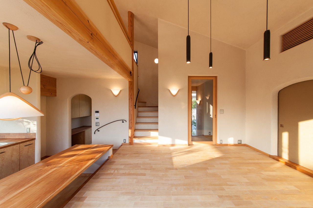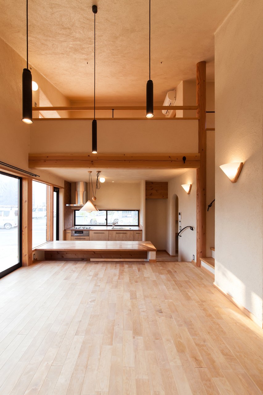 1階はキッチン~居間~和室と、床の高さを変えて柔らかく繋がっています。