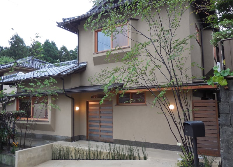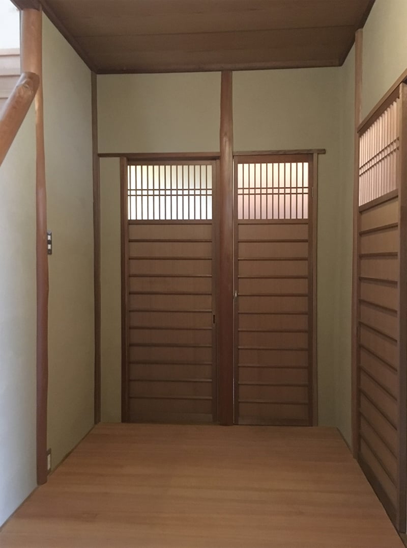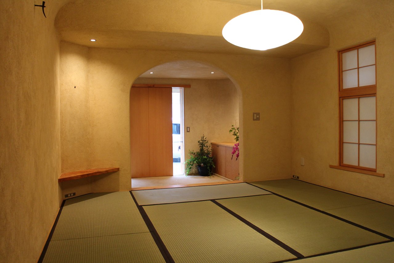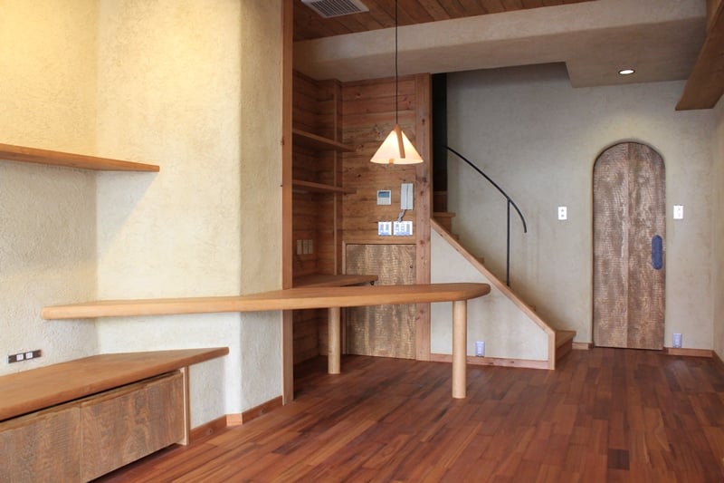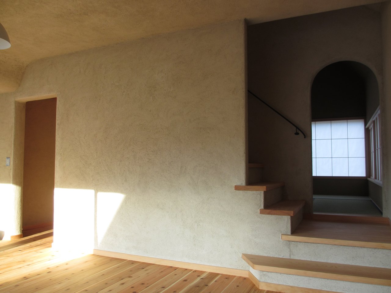外観は手を加えず、玄関扉を開けると天井・壁は漆喰仕上げ、