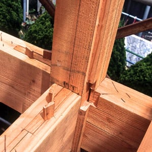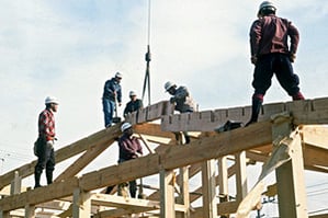 《住まい塾》から生まれる家は、見えない部分をゆるがせにせず、がっしりとした基礎、太い通し柱と太い梁を持ち、柱と梁は金物にたよらない伝統工法でしっかり組み合わされています。
